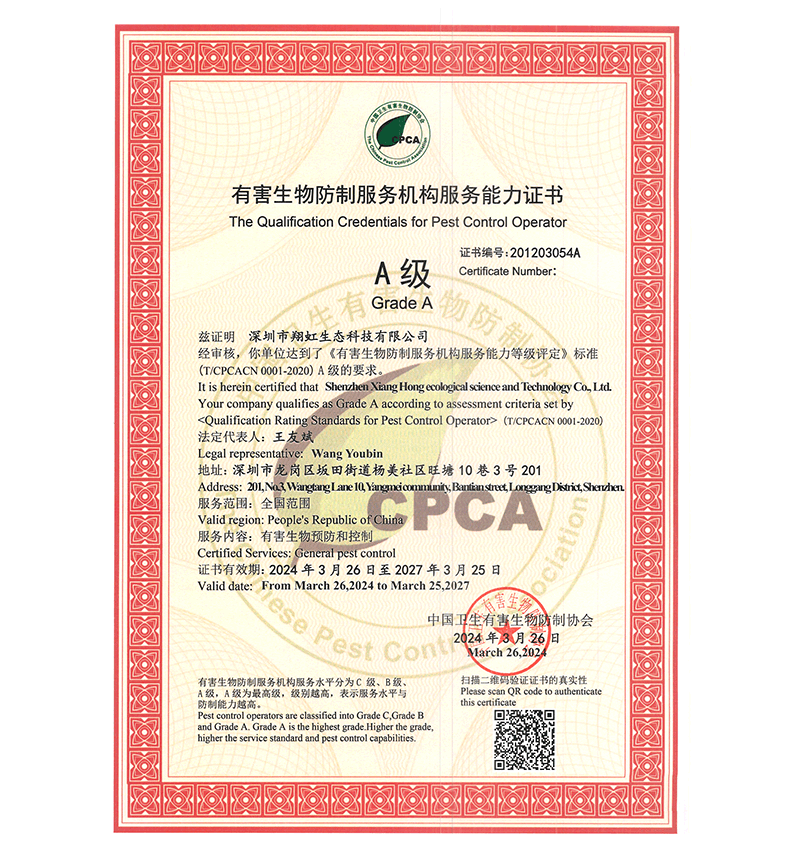 有害生物防制服務(wù)機(jī)構(gòu)服務(wù)能力證書(shū)A級(jí)